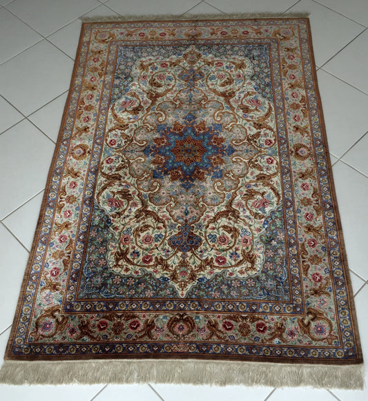 Teppich Perser Ghom Seide Meisterstück Handgeknüpfte Qom Orientteppich Blau Beige