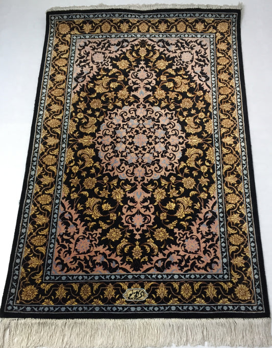 Teppich Perser Qom Seide Meister Handgeknüpft Ghom Schwarz Rosa Gold Gelb