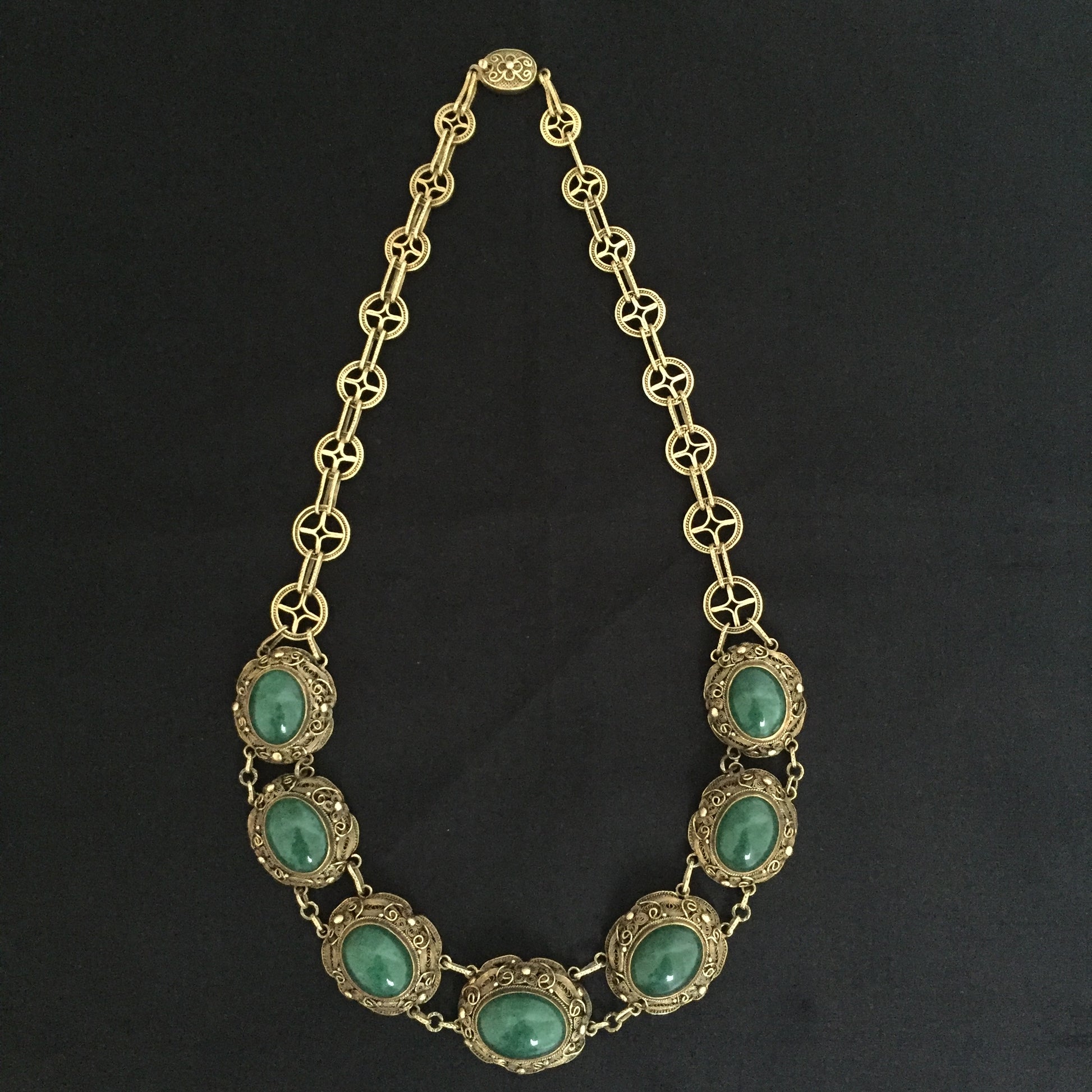 Collier Grün Achat Edelstein Schmuck Gold auf Silber Antike Kette