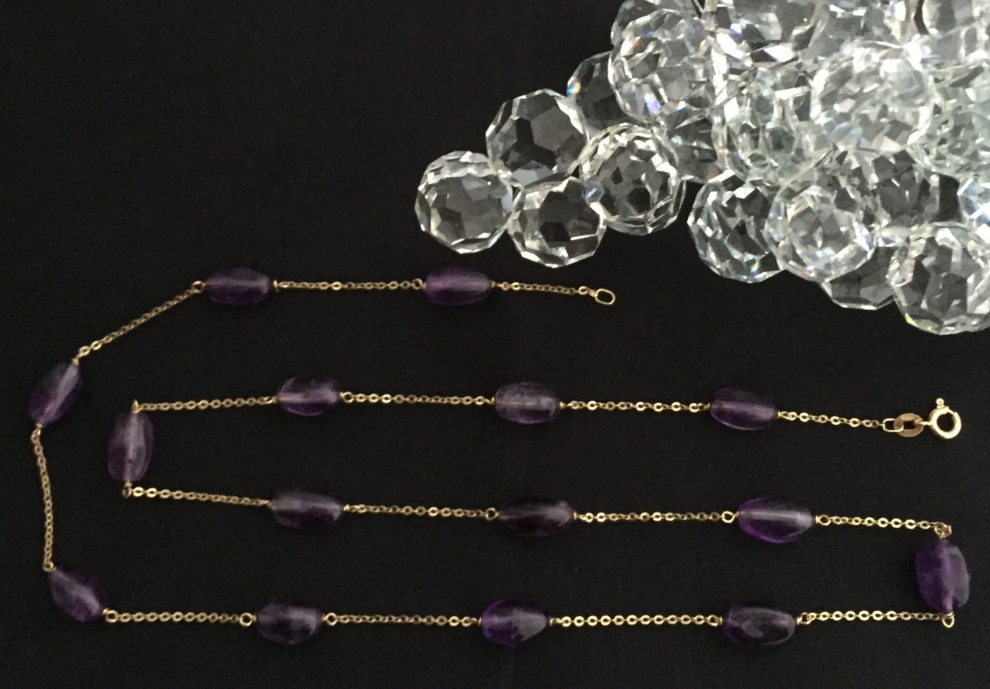 Besetzt mit 15 Amethystkugeln, ca. Durchmesser 0,85 cm , ca. Länge 61 cm, wigt 15 Gramm
