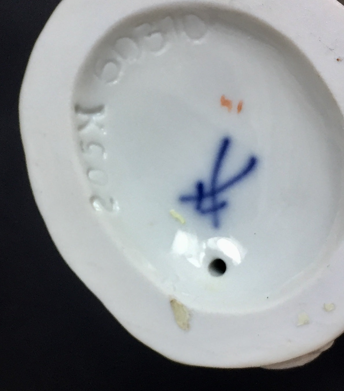 Handbemalt und Handvergoldet, Weiß glasiert , Unterglasur blaue Schwertmarke Meissen.