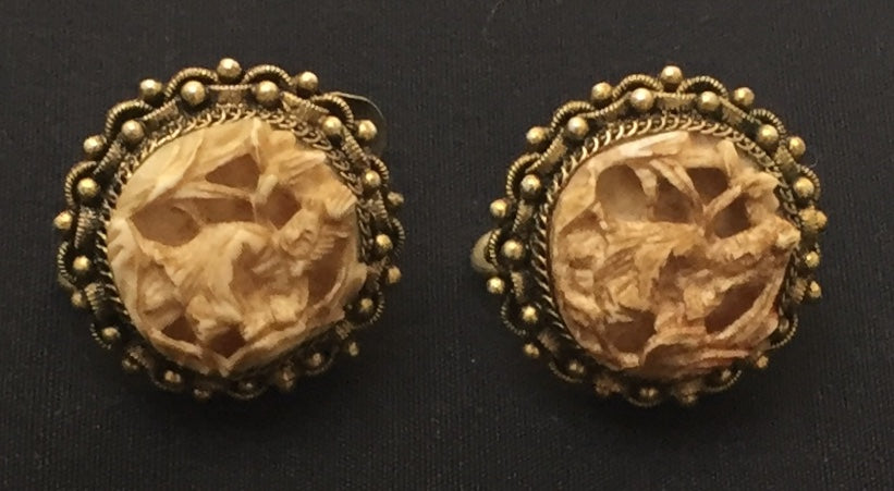 Sie bitten hier auf ein paar Antike wunderschöne China Sammlung Quant Yin Schraub - Ohrringen mit feiner Beinschnitzerei, Sung China Silber vergoldet um 1900.