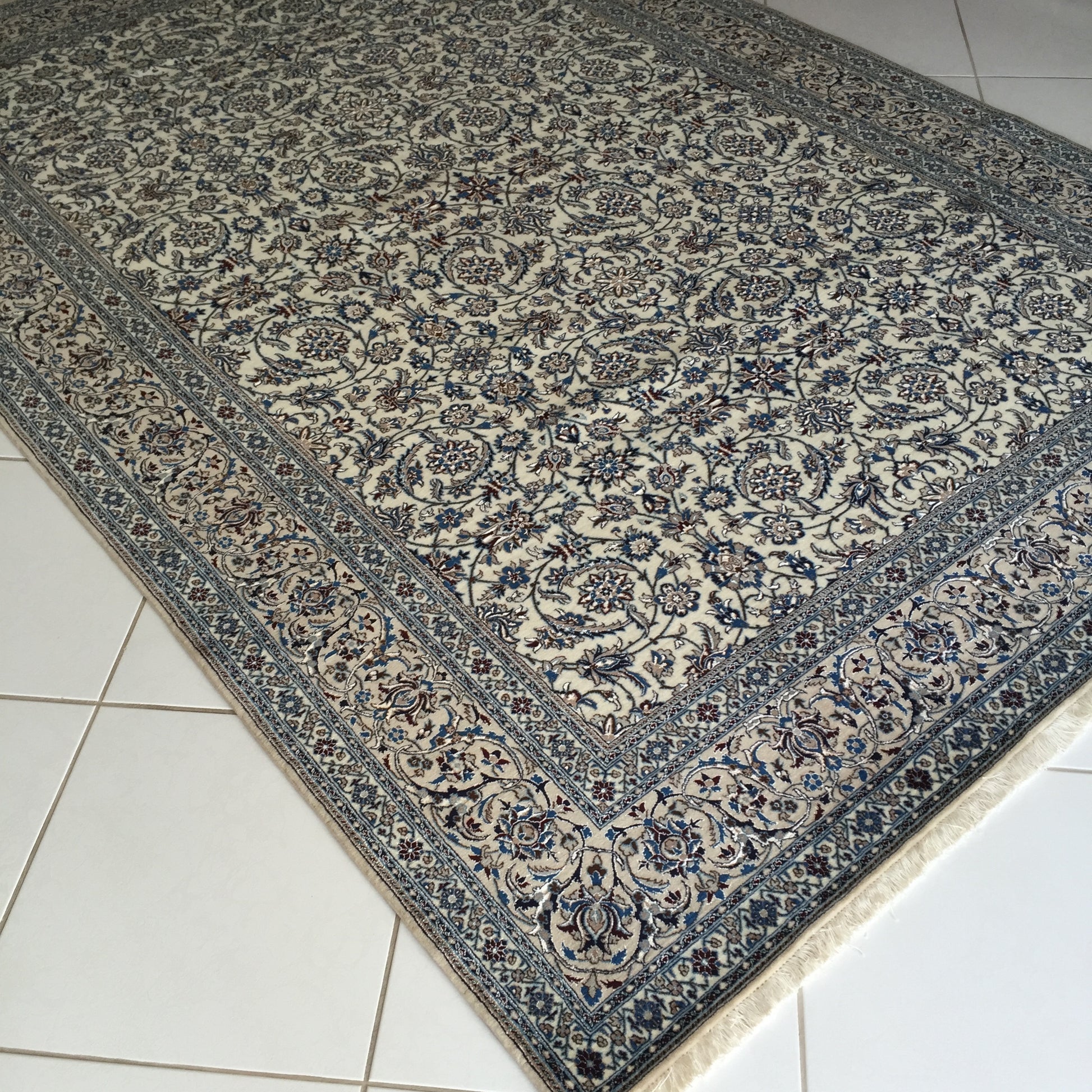 Die Teppiche der Provenienz Nain werden häufig aus sehr weicher, edl anmutenden Wolle äußerst fein geknüpft und aufwändig gestaltet. Hohe Knotendichte, erstklassiges Material ergeben die Nain Teppiche von hoher Qualität. Es wird häufig in der Flor des Nain Seide eingearbeitet, um den Kontraste hervorzuheben, dieser Nain besticht durch einen weichen und sanften Griff.