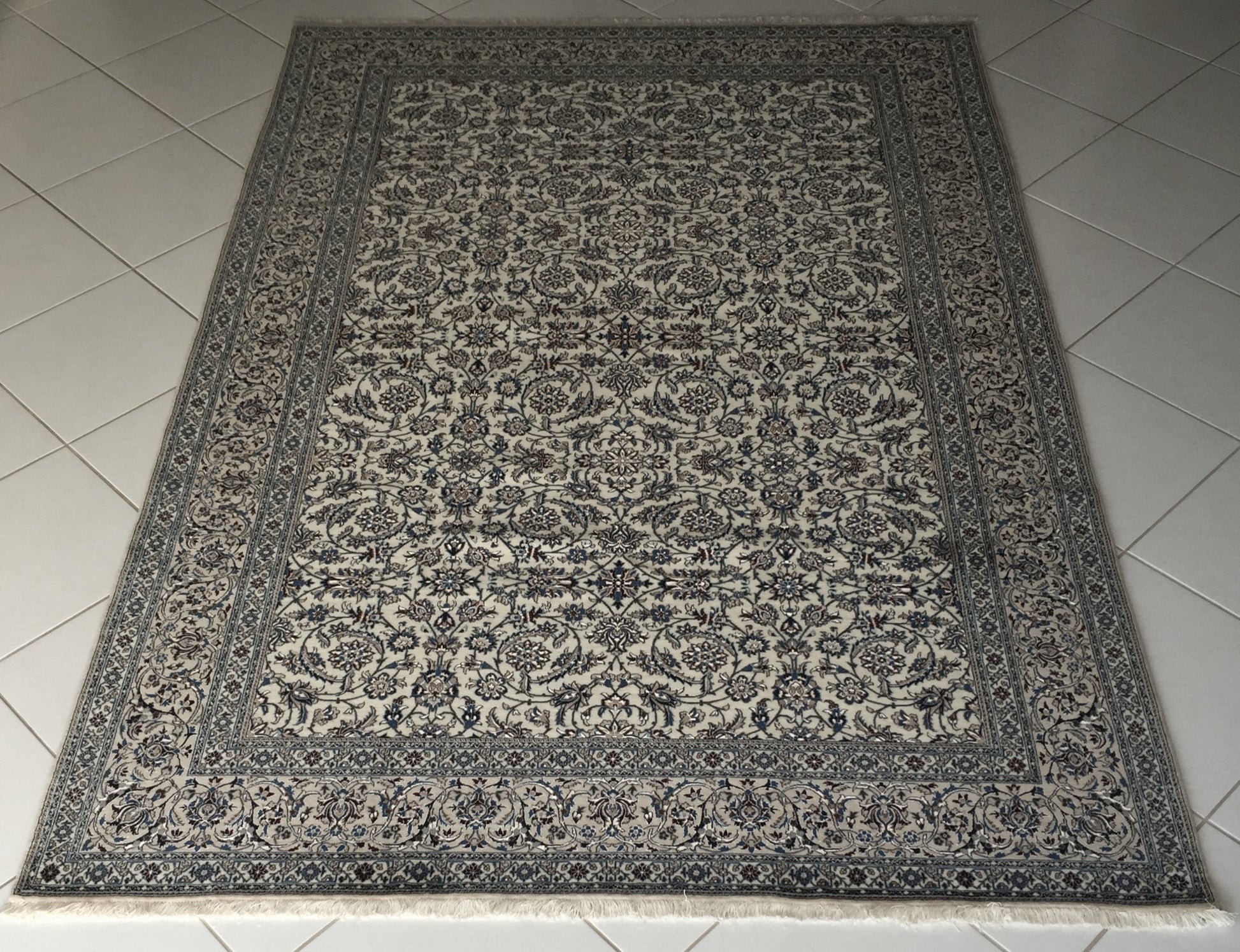 Der Stadt Nain liegt in der Zentralpersien, nahe Isfahan.Die Nain Teppiche sind in der Regel sehr hell mit cremefarbenem oder tiefblauen Fond und einem Mittelmedaillon.Bei der "4La" Nain wurde für jeden Kette - Fäden drei paar Fäden verwendet.